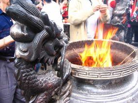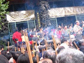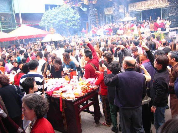 here are the pics from new year’s day. traditionally, everyone goes to the temple to pray for the new year on the first day. it’s considered really good luck if u stick the very first stick of incense into the incense pot at the temple. people line up at the door of the temple close to midnite just waiting to be that lucky person. we did the normal thing and just went during the day. needless to say, it was extremely crowded and smokie. (notice the crowdedness and smoke…